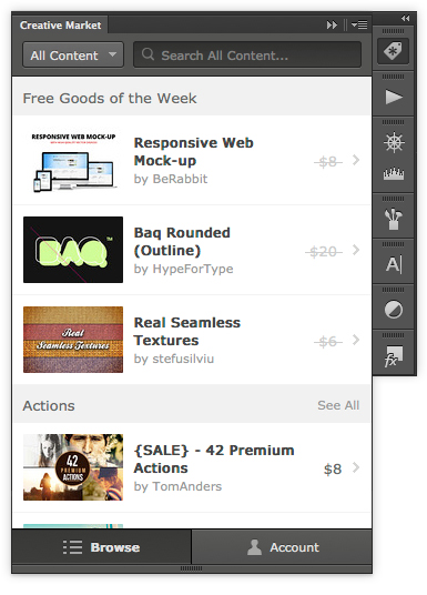 Die Creative Market-Extension erlaubt den direkten Zugriff auf Brushes, Fonts, Templates Grafiken etc. aus Photoshop.