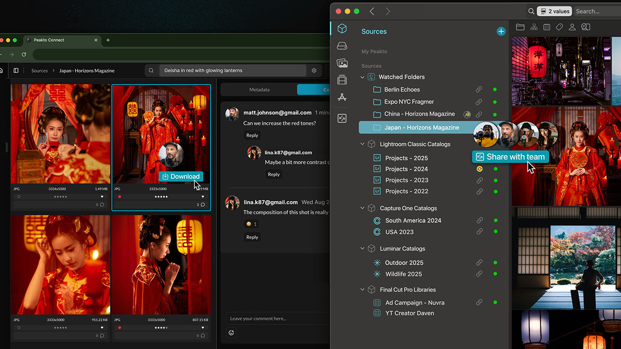 Neben der Suche nach Beschreibungen und ähnlichen Bildern ermöglicht Peakto Search in der neuen Version 1.1 auch die Suche nach Metadaten. So wird es zum „Finder“ für Lightroom und Capture One, der immer über die Menüleiste zugänglich ist und eine Vorschau der Fotos sowie einen Videoplayer bietet, der die gesuchten Inhalte in Sekundenschnelle anzeigt.