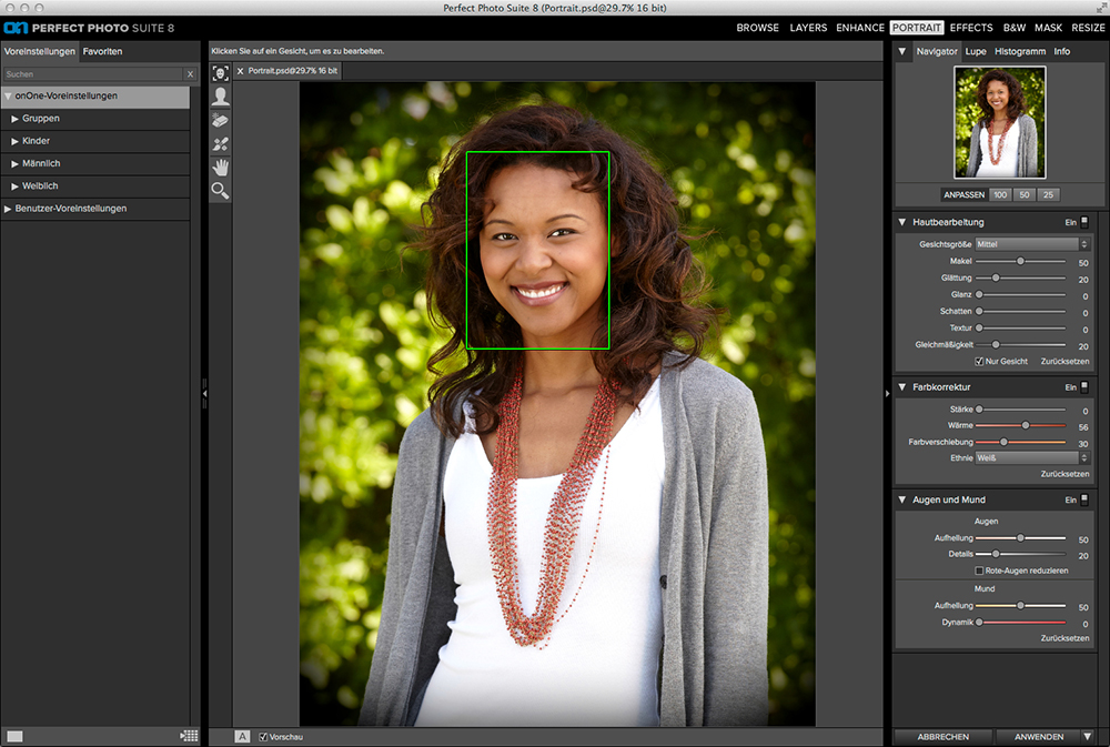 Perfect Portrait enthält Werkzeuge zur Porträtretusche und bietet neben der automatischen Gesichtserkennung Werkzeuge um Haut zu glätten, Makel zu reduzieren, Augen und Zähne aufzuhellen oder die Hautfarbe zu korrigieren.