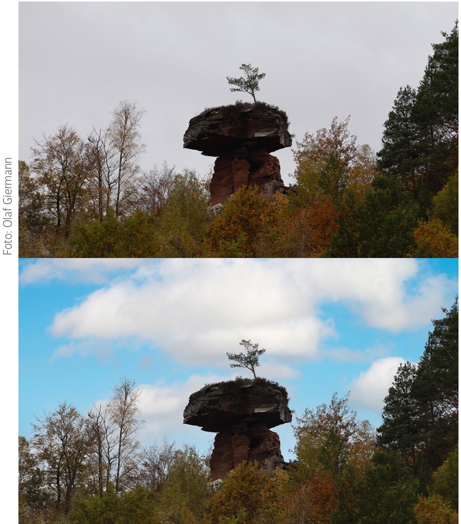 Über »Auswahl > Himmel« erzeugen Sie eine Auswahl von Bereichen, die Photoshop als Himmel erkennt. Dazu müssen diese in der Regel entweder etwas Blau oder Wolken enthalten oder durch die darunter liegenden (Stadt-) Landschaften klar als Himmel abgrenzbar sein. Möchten Sie den Himmel gegen einen anderen austauschen, wählen Sie »Bearbeiten > Himmel austauschen«. Die dabei erzeugte Maske lässt sich oft durch Dodge-and-Burn noch verbessern (siehe Seite 28, Schritt 2).