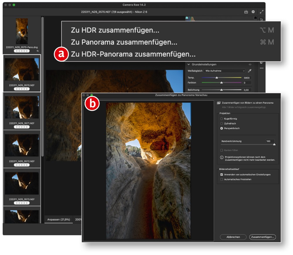 Im Filmstreifen ausgewählte Bildserien lassen sich über das Kontextmenü in hoher Qualität zu einem HDR-Bild, zu einem Panorama (hier: ein vertikales Panorama) oder einem HDR-Panorama zusammenfügen (a). Nachdem Sie im Vorschaudialog (b) passende Einstellungen getroffen haben, fügt Camera Raw die Bilder zu einem DNG zusammen, das automatisch im Dialog geladen wird und wie eine Raw-Datei weiter bearbeitet werden kann.
