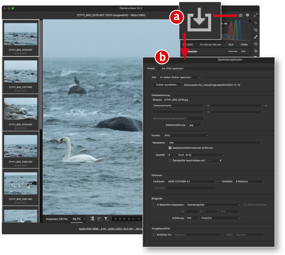 Mit Camera Raw bearbeitete Fotos werden nur in Adobe-Programmen mit dieser Bearbeitung angezeigt. Um die Dateien weiterzugeben, müssen Sie diese exportieren. Das können Sie in Bridge über das Export-Panel erledigen oder in Camera Raw über »Konvertieren und Speichern« (a) für die geladenen und im Filmstreifen ausgewählten Dateien. Die »Speicheroptionen« (b) gleichen übrigens den Arbeitsablauf-Optionen (siehe Seite 26).