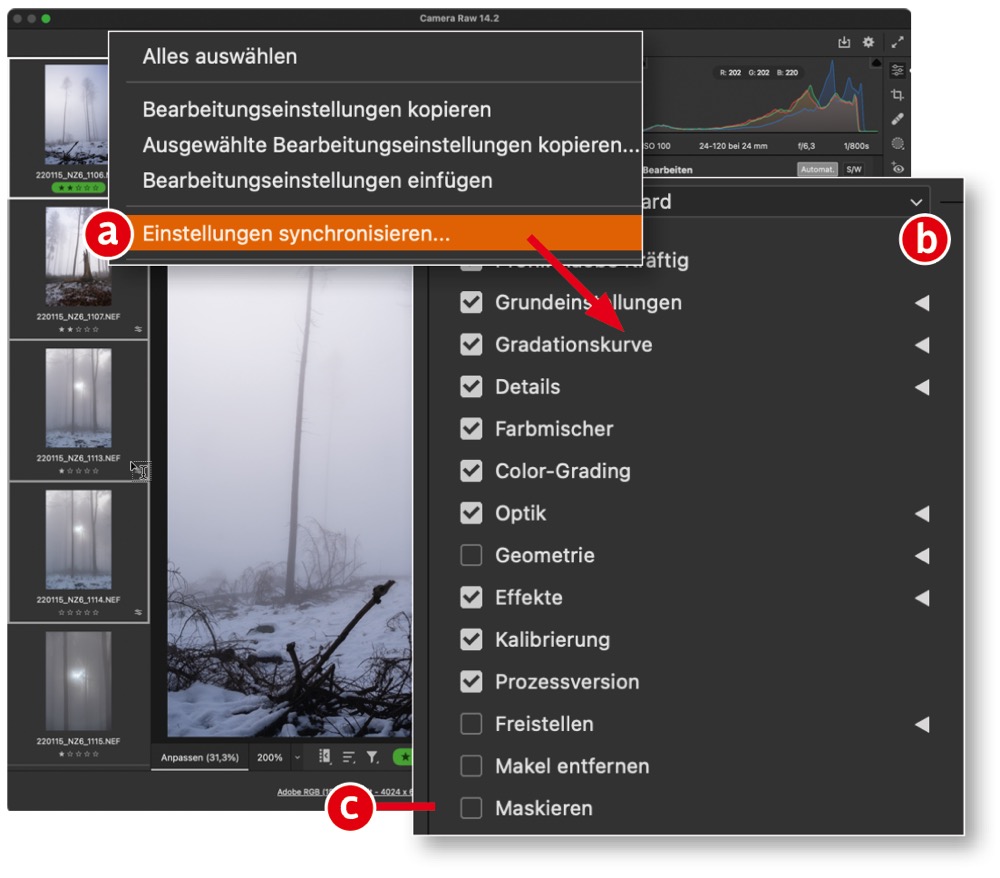 Über das Kontextmenü des Filmstreifens übertragen Sie Entwicklungseinstellungen durch Kopieren von einer Datei und Einfügen in andere ausgewählte Dateien. Die schnellere Alternative: Sind mehrere Fotos selektiert, können Sie eines davon anklicken und dessen Einstellungen schnell mit »Einstellungen synchronisieren« (a) auf die anderen übertragen. Im sich öffnenden Dialog (b) wählen Sie aus, welche angewandt werden sollen.