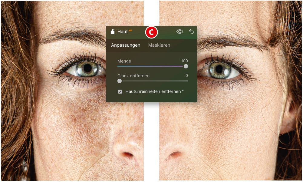 In Zukunft muss wahrscheinlich niemand mehr manuell Haut retuschieren. Denn auf künstlicher Intelligenz basierende Filter werden immer besser. Aktuell genügen die Ergebnisse nicht den höchsten Ansprüchen. So verliert die Haut beim Soften mit Photoshops Neuralfilter »Hautglättung« ziemlich viele Poren – und die Retusche von Pickeln muss man noch selbst übernehmen. Der Filter »Haut AI« von Luminar Neo (c) geht da schon einen Schritt weiter und kann zumindest kleinere Hautunreinheiten selbst erkennen und entfernen. Bezüglich des Glättungseffekts entspricht das Ergebnis in etwa dem von Photoshops Neuralfilter.