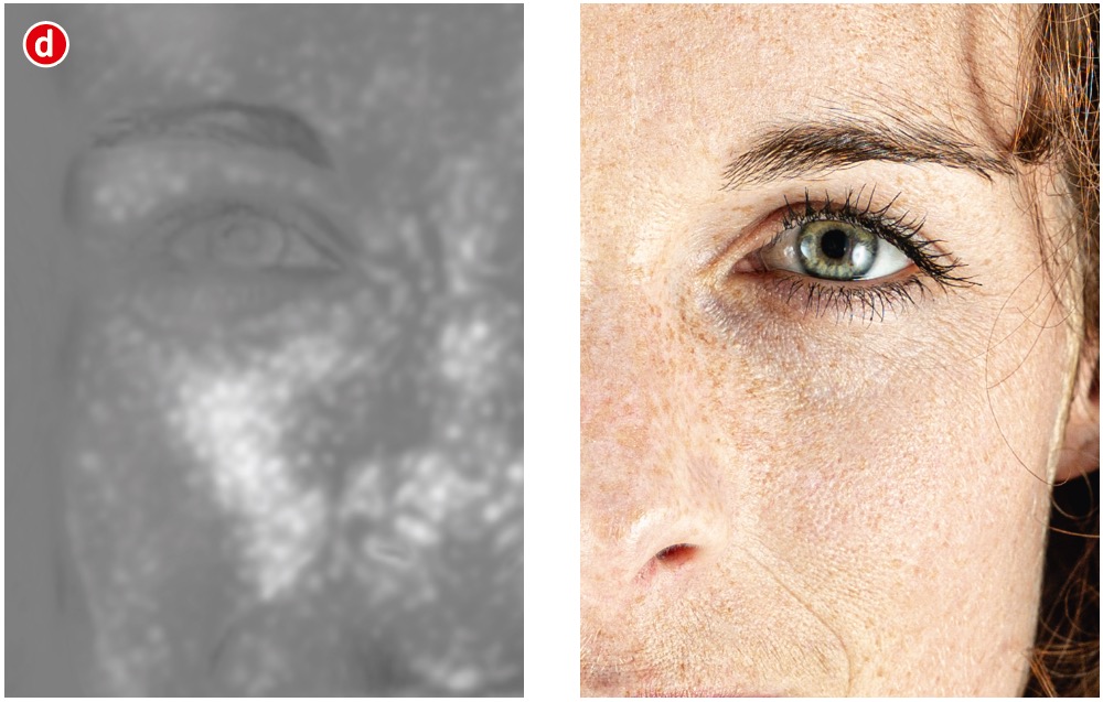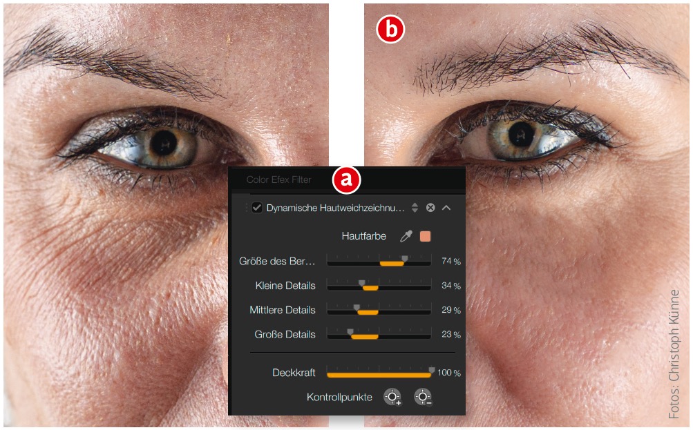 Der einfachste Weg zu einem klaren Hautbild per Hautretusche besteht darin, die Arbeit einfach einem darauf spezialisierten Programm zu überlassen. Herkömmliche Photoshop- und Lightroom-Plug-ins wie Portraiture, PortraitPro oder Color Efex Pro aus der DxO Nik Collection führen bei Filtern wie »Dynamische Hautweichzeichnung« (a) unter der Haube nichts anderes als eine Frequenztrennung (siehe S. 28 f.) durch. Dadurch können Sie verschiedene Hautdetails unabhängig voneinander per Schieberegler glätten. Das Ergebnis wirkt bei geringer Stärke natürlich, erzeugt aber schnell ein leicht teigiges Aussehen der Haut (b).