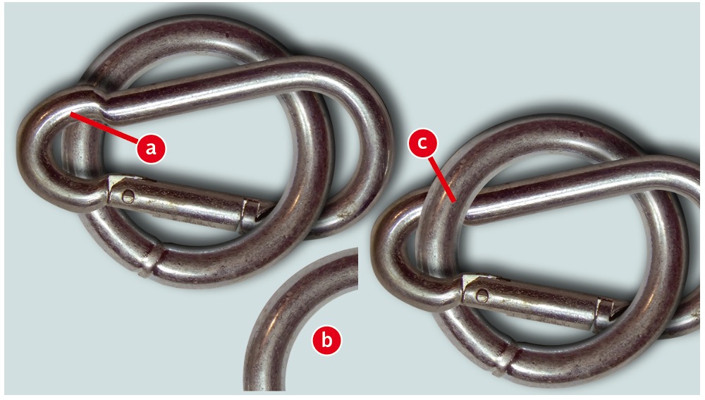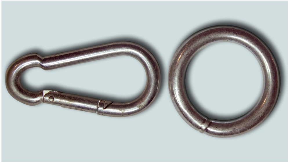 Weil der Auftraggeber die Veröffentlichung der Objekte nicht wünschte, habe ich die Vorgehensweise hier einfach mit einem Ring und einem Karabinerhaken nachvollzogen. Wie deren Verkettung aussehen sollte, zeigt das Foto oben. Um es nicht zu kompliziert zu mache, habe ich auf zwei Aspekte verzichtet: die minimale perspektivische Verkürzung der beiden Objekte, da sie nicht flach auf dem Untergrund aufliegen, sondern jeweils auf dem Material des anderen, sowie die Tatsache, dass dadurch die Schlagschatten ebenfalls verzerrt werden, da die Entfernung zum Untergrund variiert.