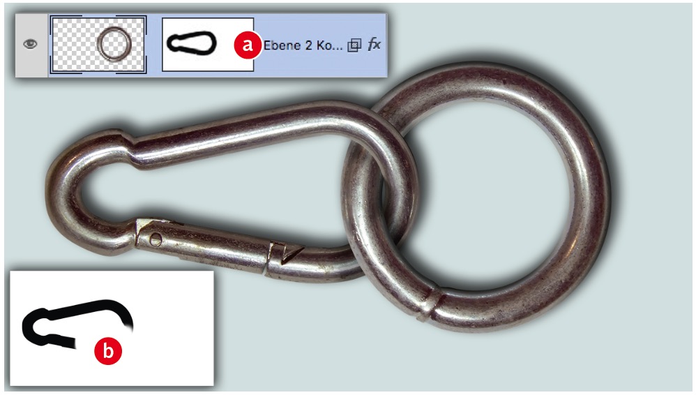 Zunächst stellen Sie Ring und Haken frei und verteilen sie auf zwei Ebenen. Die Schlagschatten – passend zur Beleuchtungsrichtung bei der Aufnahme – ergänzen Sie mit dem gleichnamigen Ebenenstil. Ginge es nur um ein einziges Bild wie das nebenstehende, wäre die Aufgabe schnell gelöst: Sie müssten der Ebene eines der beiden Objekte nur eine Ebenenmaske zuweisen, die sich dadurch ergibt, dass Sie dort die Pixel der Ebene des anderen Objekts als Auswahl laden und den Bereich schwarz färben (a). Da der dann allerdings den Ring überall ausblenden würde, müssen Sie den geplanten Überlappungsbereich weiß übermalen (b).