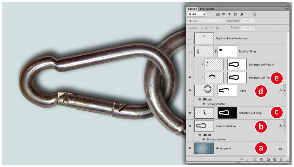 Diese Aufgabe ist anspruchsvoller, da die Objekte nicht nur frei bewegt werden, sondern auch Schatten aufeinander werfen sollen. Das erfordert etliche Ebenen: Hintergrund (a), Karabinerhaken mit Ebenenstil »Schlagschatten« (b), Schattenwurf des Rings auf den Haken (c) (mit Ebenen- oder als Schnittmaske), Ring mit Ebenenstil »Schlagschatten« (d), Schlagschatten des Hakens auf den Ring als Schnittmaske (e). Die drei ausgeblendeten Ebenen oben benötigen Sie später, wenn Sie den Ring über die Grenzen der Ebenenmasken hinausziehen 5, 6, die eine teilweise Verdeckung bewirken. Die Ebenenmasken von (c) und (d) dürfen nicht verkettet sein!