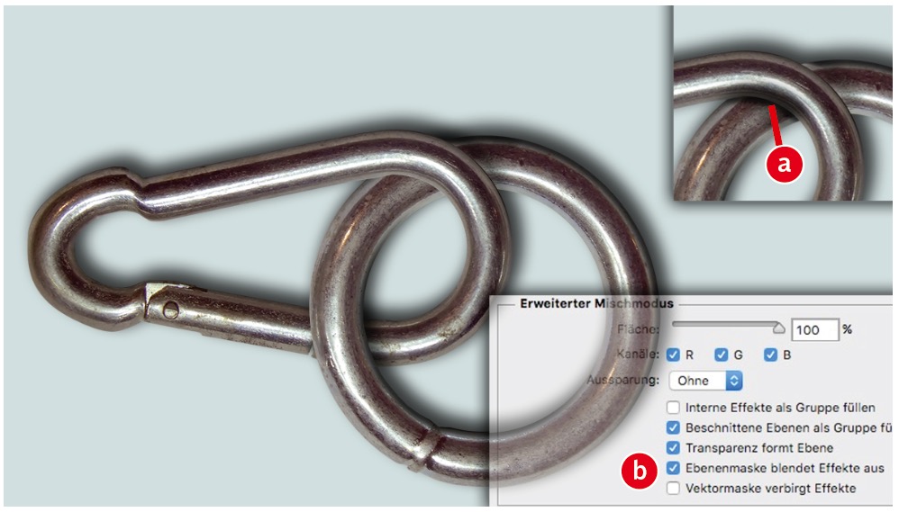 Bei starker Verschiebung würde jedoch der »Ebenenstil > Schlagschatten« des Rings sichtbar (a). Das vermeiden Sie, indem Sie »Ebenenstil > Mischoptionen: Eigene > Ebenenmaske blendet Effekte aus« (b) aktivieren.