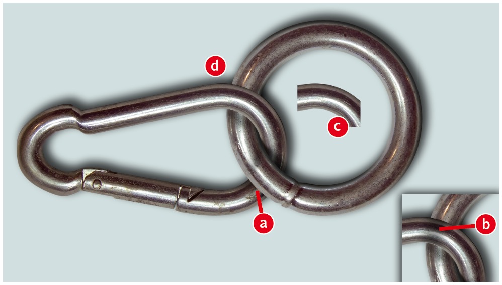 Leider hat das seine Grenzen. Ziehen Sie zum Beispiel den Ring weit nach oben, liegt sein unten noch sinnvoller Schatten (a) nun oben auf ihm (b). Er wird wegen dieser Verschiebung (und innerhalb der Grenzen des Hakens, also seiner Ebenenmaske) an dieser unerwünschten Stelle sichtbar. Es wäre nicht sinnvoll, für diese eine Position die Grundlagen der Ebenenkomposition zu zerstören und Schatten oder Ebenenmaske zu retuschieren, daher sollten Sie diesen Bereich des Hakens aus seiner Ebene kopieren (c) und überlagern (d) (im Ebenen-Bedienfeld von Bild 3 die oberste Ebene).