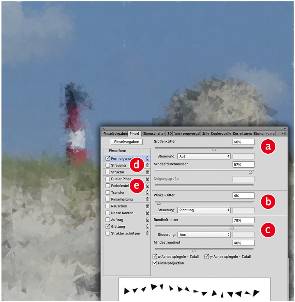 Wichtig ist die Größe der verwendeten Werkzeugspitze, aber auch unter »Pinselform > Abstand« (der hoch sein sollte, damit die einzelnen Abdrücke nicht zu dicht zusammenkleben). Experimentieren Sie bei »Formeigenschaften« mit Jitter-Werten für »Größe« (a), Winkel (b) – mehr dazu in Schritt 4 – und »Rundheit« (c), gegebenenfalls leichter »Streuung« (d) sowie geringen Abweichungen unter »Farbeinstellungen« (e).