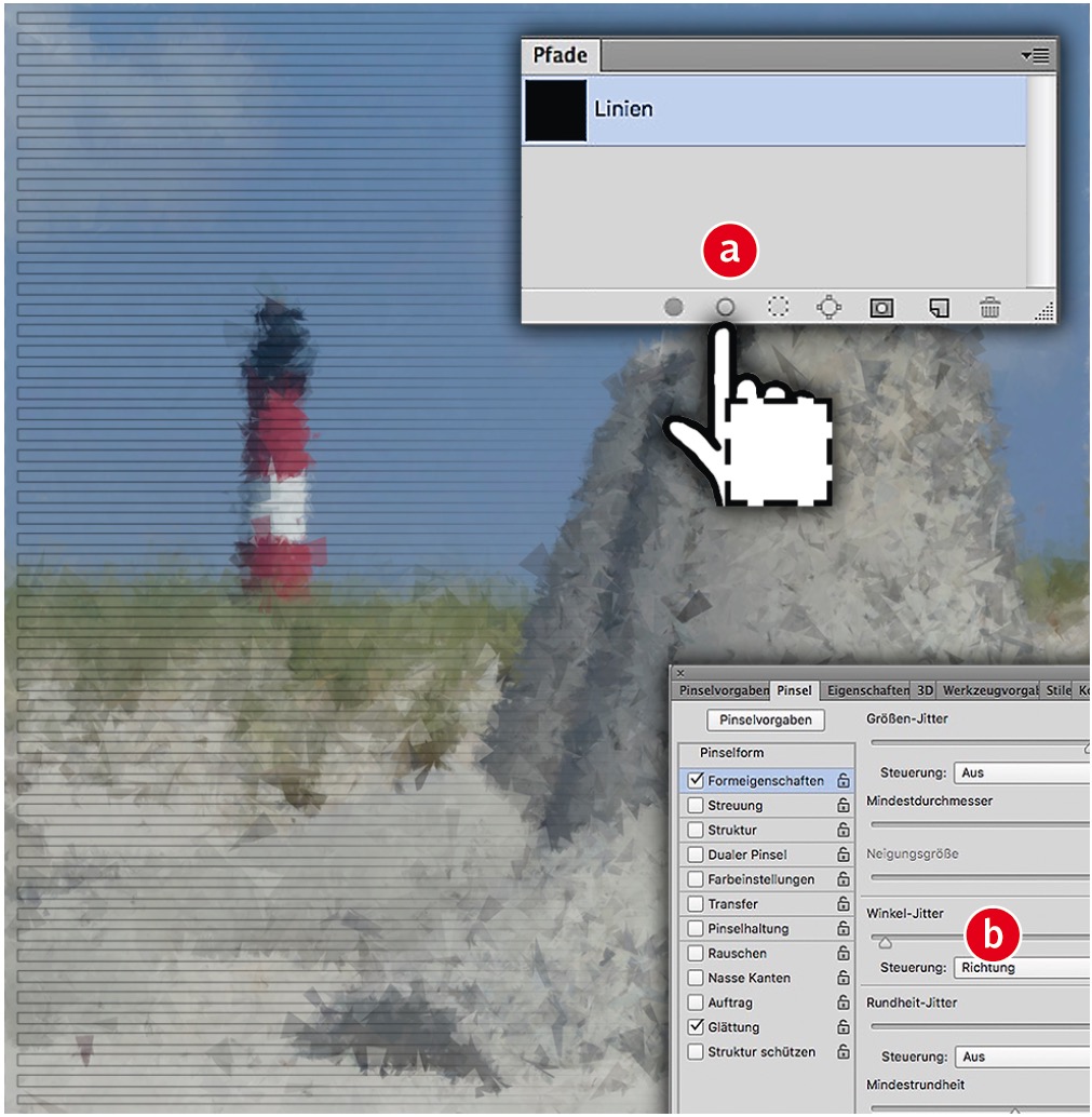 Aktivieren Sie den Pfad im Pfade-Bedienfeld und klicken Sie auf das Symbol für »Pfadkontur mit Pinsel füllen« (a). (Die Bezeichnung ist eigentlich falsch – es geht um jedes spurerzeugende Werkzeug.) Photoshop verteilt nun die Werkzeugspitzen entlang des Pfades mit den eingestellten Pinsel-Parametern; wichtig ist dabei unter Winkel die »Steuerung > Richtung« (der Mausbewegung oder dem Pfad folgend) und der »Winkel-Jitter« (b). Aber …