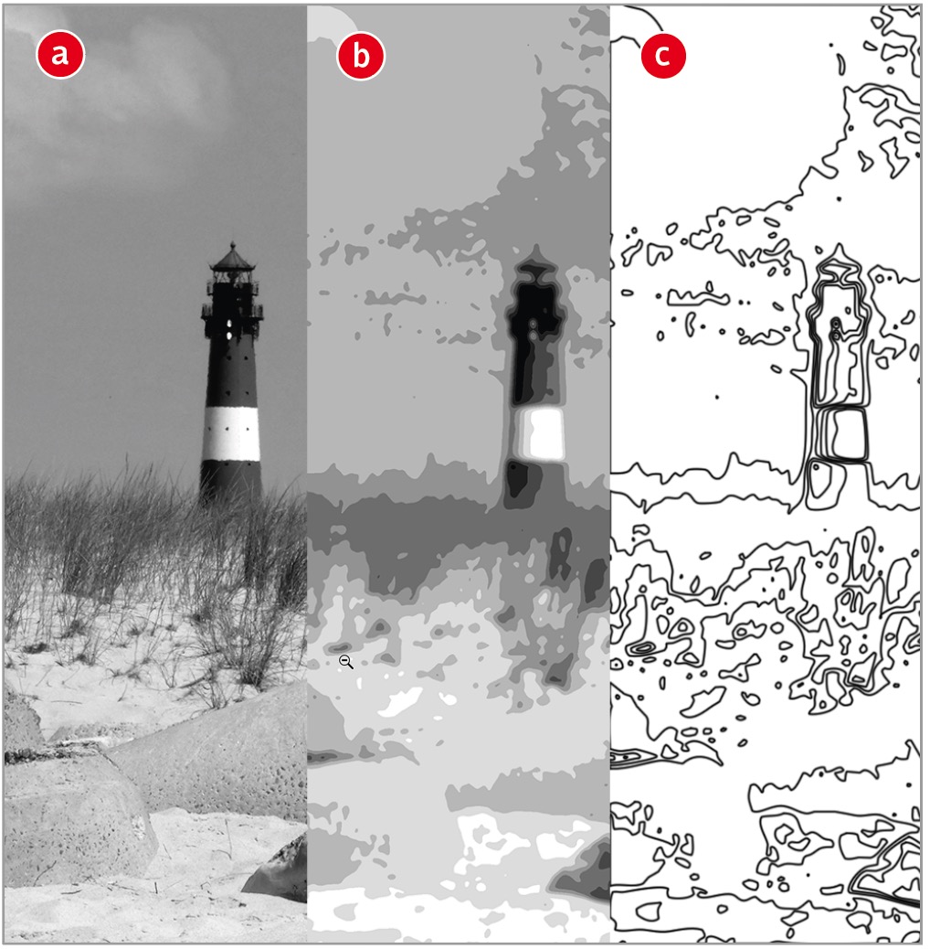 … für pfadgeleitetes Nachzeichnen von Linien ist ein hoher »Winkel-Jitter« sinnvoll. Um jedoch den Effekt von Geometrize zu erzielen, Spuren an Formen zu orientieren, sollte der Wert sehr niedrig sein. Passende Pfade erzeugen Sie so: »Sättigung verringern« (a), eine Kombination aus Weichzeichnung, »Tonwertkorrektur« und »Tontrennung« (b), »Stilisierungsfilter > Leuchtende Konturen«, dann »Invertieren« (c) und daraus Pfade machen.