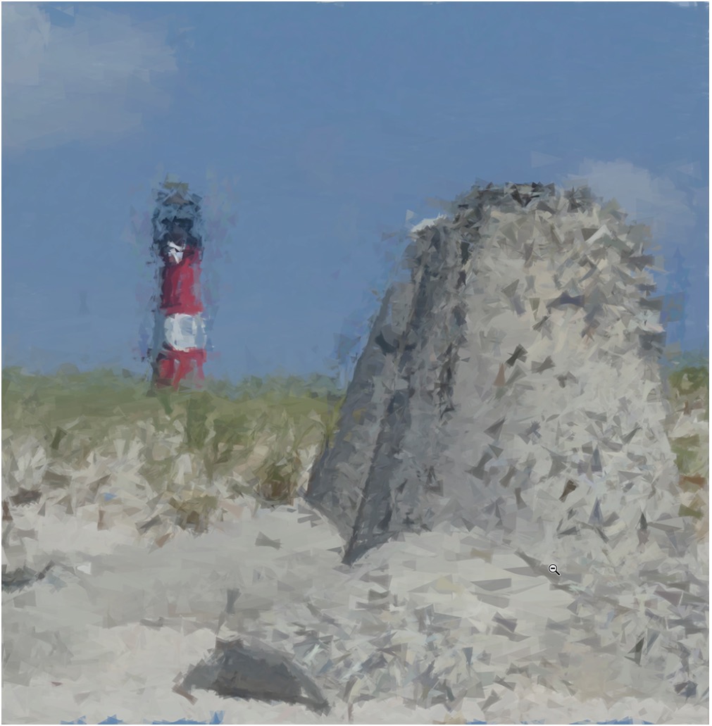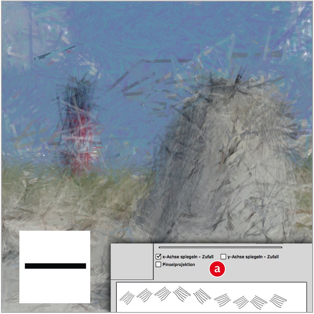 Ich hatte in den bisherigen Schritten ein Dreieck als Werkzeugspitze gewählt, ähnlich wie bei der Palmwedel-Umsetzung von Geometrize. Selbstverständlich steht Ihnen für den »Musterstempel« jede beliebige Spitze zur Verfügung. Bei „freien“ Werkzeugspitzen erzielen Sie eine größere Variation, wenn Sie unter »Formeigenschaften« zufallsgesteuertes Spiegeln der x- und/oder y-Achsen zulassen (a) – bei einem Strich natürlich nicht.