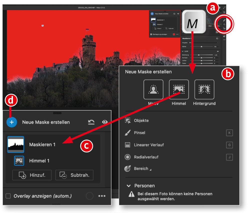 Möchten Sie nicht das gesamte Bild, sondern nur bestimmte Bereiche ändern, bietet Camera Raw dafür leistungsfähige Maskierungswerkzeuge für selektive Korrekturen. Den Maskierungsbereich öffnen Sie über die entsprechende Schaltfläche in der Werkzeugleiste oder mit dem Tastenkürzel »M« (a). Wählen Sie das geeignete Werkzeug für die Maskierung aus (b). Schnell und oft genau genug funktionieren die KI-basierten Werkzeuge mit automatischer Erkennung von Motiv, Himmel, Hintergrund, Objekten und Personen. Aber auch die traditionellen Maskierungswerkzeuge (Pinsel, linearer und radialer Verlauf) sind nach wie vor nützlich. Bereichsmasken für Helligkeit, Farbe oder Tiefeninformationen erlauben das Finetuning von Masken anhand der gleichnamigen Eigenschaften. Im Maskenbedienfeld (c) erscheinen angelegte Masken als Ebenen. Für das Korrigieren weiterer Bereiche erzeugen Sie neue Masken (d).
