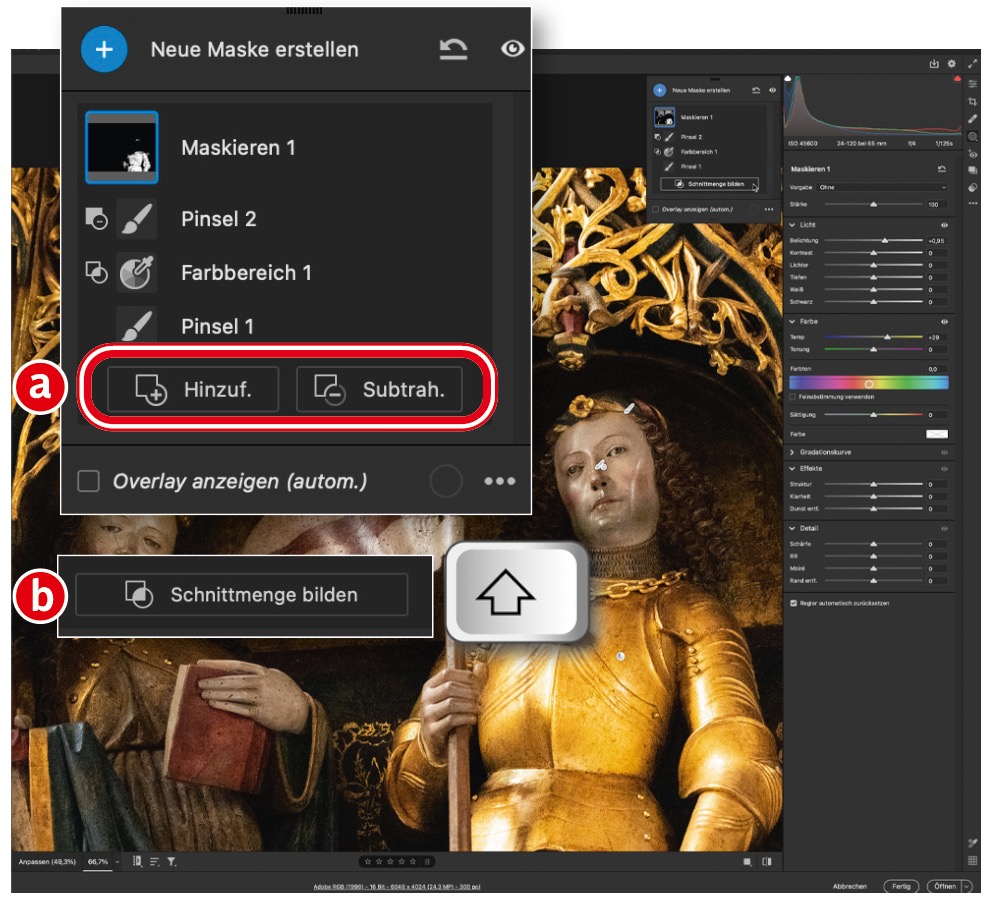 Jede Maske kann aus einer non-destruktiven Kombination mehrerer Werkzeuge zusammengestellt werden. Klicken Sie auf »Hinzufügen«, um mit einem Werkzeug Ihrer Wahl maskierte Bereiche zu erweitern, auf »Subtrahieren«, um Bereiche zu entfernen (a). Sehr nützlich ist die Schnittmengen-Funktionen, die anstelle der beiden abgebildeten Schaltflächen erscheint, wenn Sie die Shift-Taste drücken (b). Sie erlaubt beispielsweise das Kombinieren des Pinselwerkzeugs mit einer Farbbereichsauswahl. Im Beispiel wurde so das Gold verstärkt, das zunächst mit groben Pinselstrichen ausgewählt und dann für eine höhere Genauigkeit mit einer Farbbereichsmaske auf Gelbtöne beschränkt wurde.