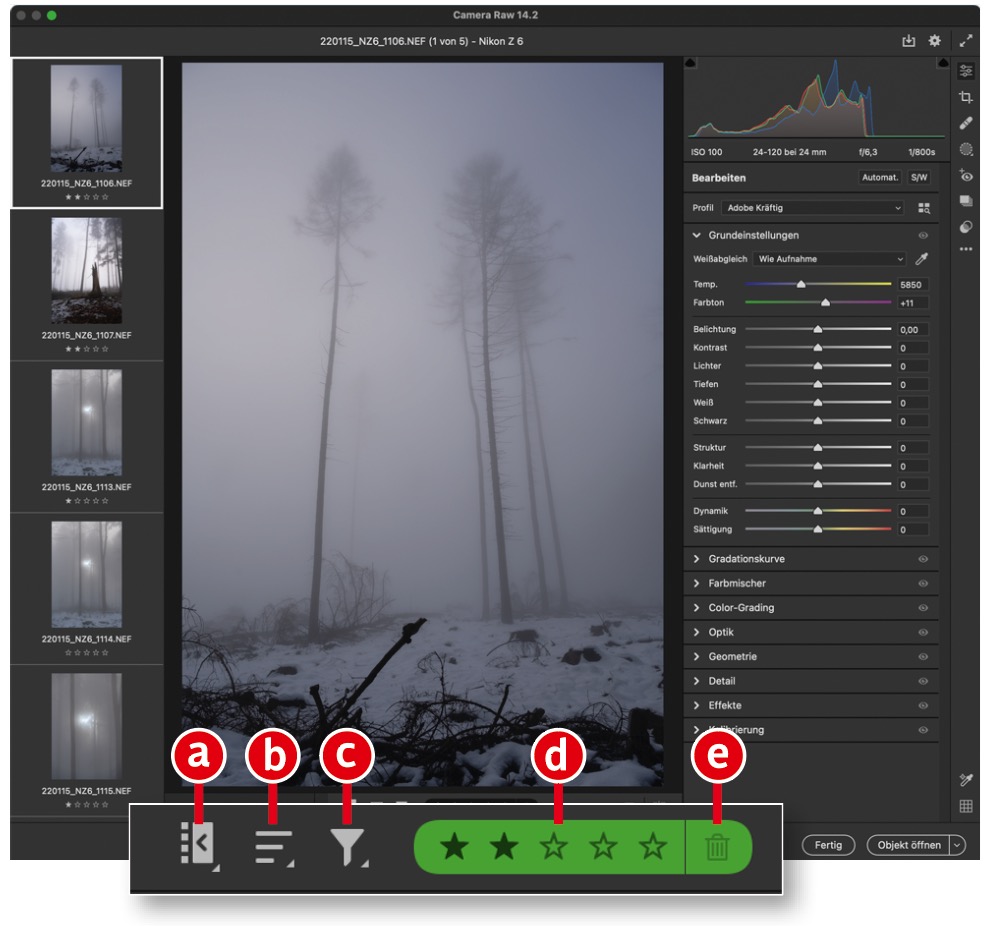 Unter dem Bild finden Sie Optionen, um den Filmstreifen aus- und einzublenden (a), die dort angezeigten Bilder nach Datum, Name, Bewertung zu sortieren (b) oder sie zu filtern (c). Hier können Sie die Bilder zudem mit Sternen bewerten oder farblich markieren (d). Am schnellsten vergeben Sie 0 bis 5 Sterne mit den Tasten 0 bis 5. Mit den Tasten 6 bis 9 und »Strg/Cmd-Shift«-0« weisen Sie die Farbmarkierungen Rot, Gelb, Grün, Blau beziehungsweise Pink zu oder löschen diese. Klicken Sie das Eimersymbol (e) an, wird das Foto zur Löschung vorgemerkt und in den Papierkorb verschoben, sobald Sie Camera Raw verlassen.