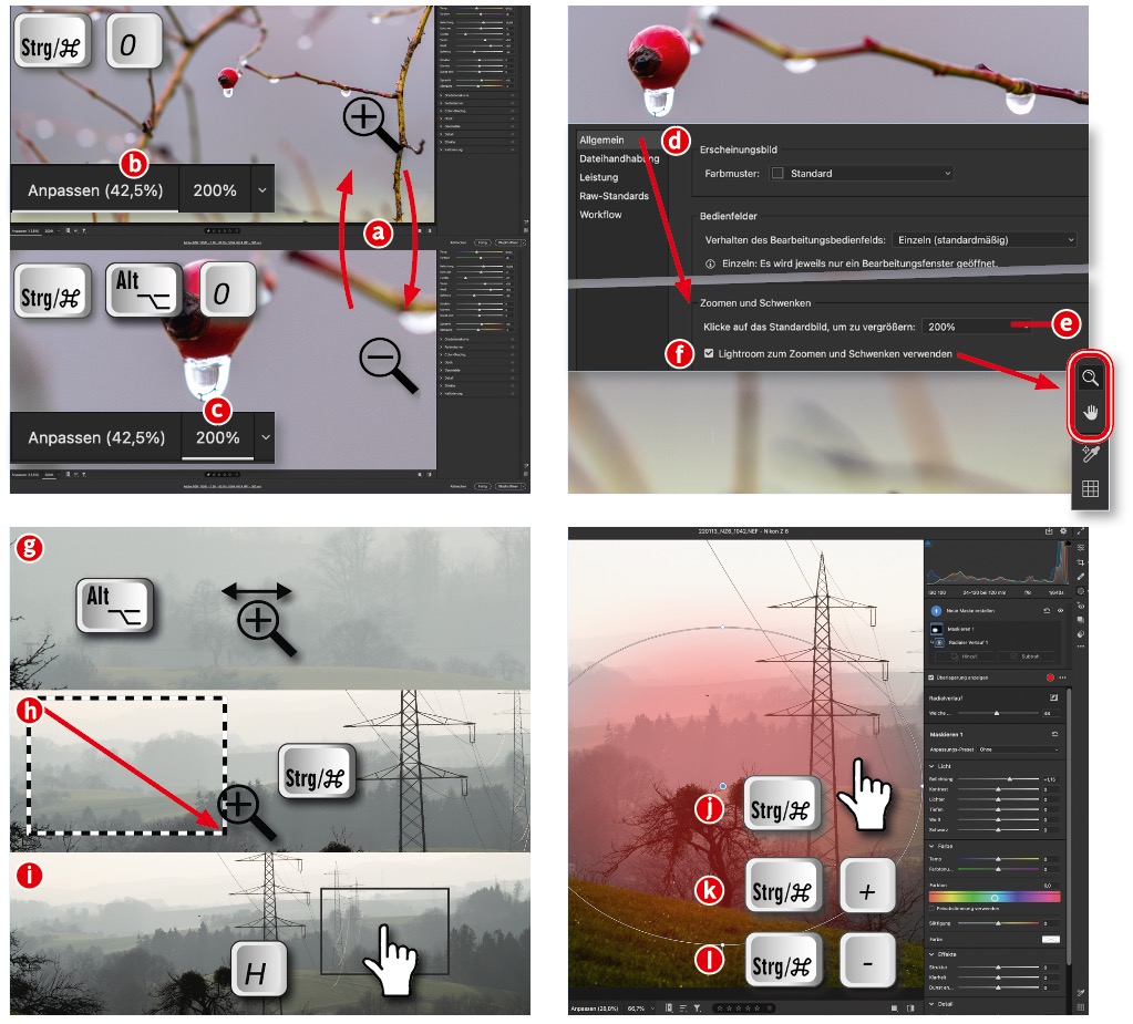 Als Standard zoomt Camera Raw per Maus-Klick auf 100 Prozent. In den Camera Raw-Voreinstellungen unter »Allgemein« (d) lässt sich die Standard-Zoomstufe ändern (e), etwa auf 200 Prozent für hochauflösende Monitore. »Lightroom zum Zoomen und Schwenken« (f) deaktivieren Sie, falls Sie das Zoom- und Handwerkzeug einblenden und manuell zwischen diesen wechseln möchten. Halten Sie die Alt-Taste gedrückt, können Sie stufenlos durch Klicken und horizontales Ziehen die Darstellungsgröße ändern (g). Möchten Sie dagegen auf einen bestimmten Ausschnitt zoomen, halten Sie die Strg/Cmd-Taste gedrückt und ziehen ein Rechteck um diesen Ausschnitt auf (h). Mit gehaltener Taste »H« können Sie durch Klicken – wie in Photoshop – in die „Vogelperspektive“ wechseln und den Bildausschnitt ändern (i).