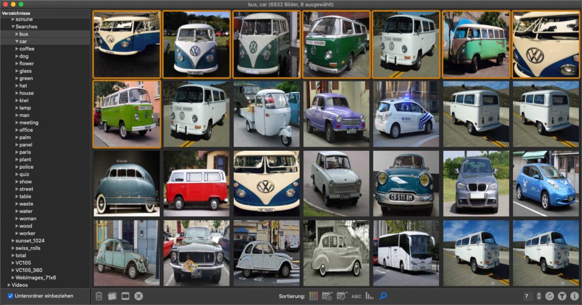 - Sortierung nach Inhalt/Farbe, Erstellungsdatum, Änderungsdatum, Dateiname, Dateigröße und Ähnlichkeit zu ausgewählten Bildern