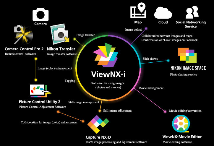ViewNX-i verfügt über die intuitiv zu bedienende Benutzeroberfläche des Vorgängerprogramms ViewNX2. Darüber hinaus bietet das Programm neue Features wie z. B. Sidecar-Dateien, die eine verlustfreie Bildbearbeitung ermöglichen. Außerdem kann der Benutzer über die ViewNX-i-Plattform seine Bilder schnell in sozialen Netzwerken veröffentlichen.
