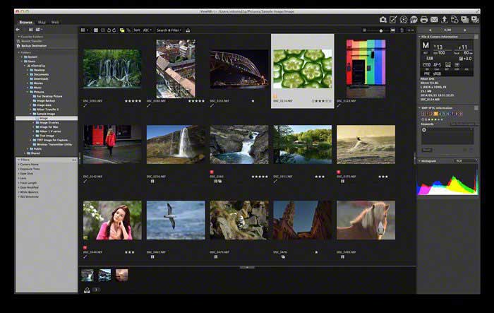 - Die anpassbare Bildsortierung vereinfacht die Suche nach Fotos und Filmen. Bilddateien können gekennzeichnet und bewertet werden, um sie später schnell abrufen zu können. Bei der Suche sind detaillierte Kriterien auswählbar, einschließlich eines Aufnahmedatenfilters, der eine Selektion nach Kamera, Objektiv, ISO-Empfindlichkeit, Belichtungsdauer, Brennweite und Weißabgleich erlaubt. Es lassen sich auch Bilder aus mehreren Unterordnern anzeigen. Bilder, die mit einer Nikon-1-Kamera im Modus Smart Photo Selector aufgenommen wurden, können in einer Datei gruppiert werden, um die Bearbeitung zu erleichtern.