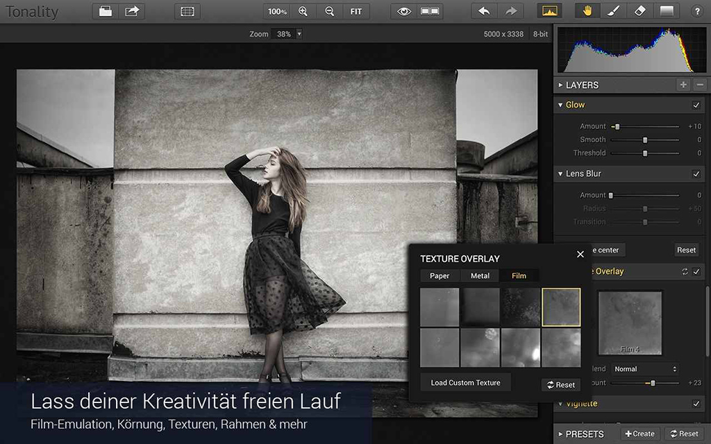 Macphun Software hat eine Schwarzweiß-App für den Mac veröffenlicht, die über einen 16-Bit Raw-Prozessor und Funktionen verfügt, die klassische Dunkelkammer-Techniken digital nachbilden und um diverse Effekte erweitern. Tonality bietet dem Anwender eine Reihe von Presets für vorgefertigte Effekte, die sich per Mausklick anwenden lassen. Es besteht die Möglichkeit, mehrere Ebenen, deren Deckkraft einstellbar ist, anzulegen und Bildkorrekturen wie Belichtung, Kontrast, Klarheit und Struktur nicht-destruktiv durchzuführen. Darüber hinaus können Bilder mit stilisierenden Texturen überlagert, farbig getont sowie mit Körnungs-und Filmemulationen, Glow-Effekten, Bewegungsunschärfe, Vignetten oder Rahmen versehen werden.