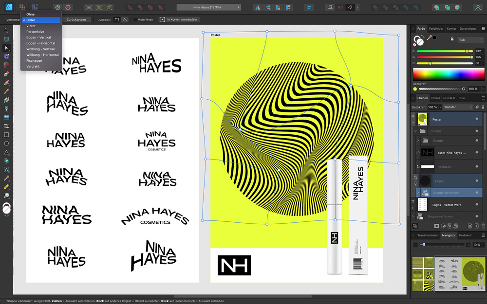 Gitterverzerrung in Echtzeit: Ermöglicht das non-destruktive Anpassen eines Bildes oder einer Datei an die Oberfläche einer darunter liegenden Oberfläche. Alle Einstellungen lassen sich jederzeit ändern. Kann beispielsweise für Mock-ups verwendet werden.