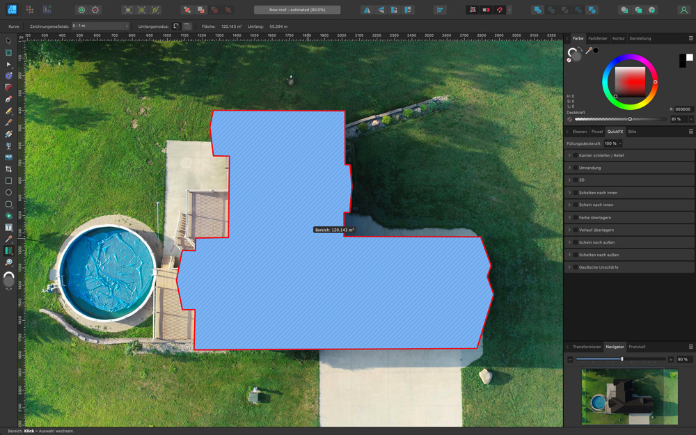 Maßwerkzeug und Flächenwerkzeug: Dient dazu, Linienlängen, Segmente, Abstände und Flächen beliebiger Objekte in dem selbst festgelegten Maßstab auszumessen. Mit dem Maßwerkzeug lässt sich der Abstand zwischen zwei Punkten/Objekten und mit dem Flächenwerkzeug der Umfang, die Fläche oder die Länge einzelner Segmente von geschlossenen Formen ermitteln.