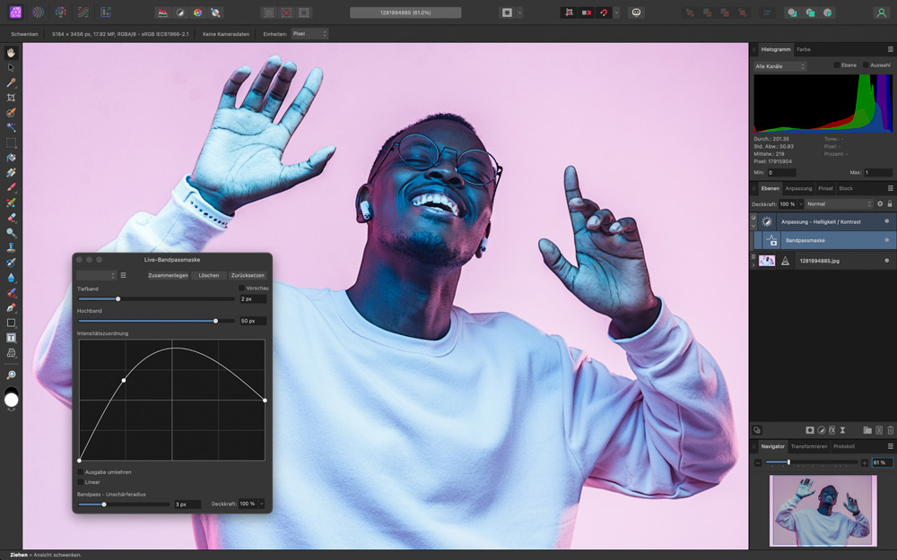 Bandpass: Per Bandpass kann man eine Maske erzeugen, die sich auf die Kontrastgrenzen in einem Bild konzentriert. Dies ist praktisch für die Retusche, wenn man sich auf verschiedene Frequenzebenen konzentrieren will, aber auch für kreative Effekte.