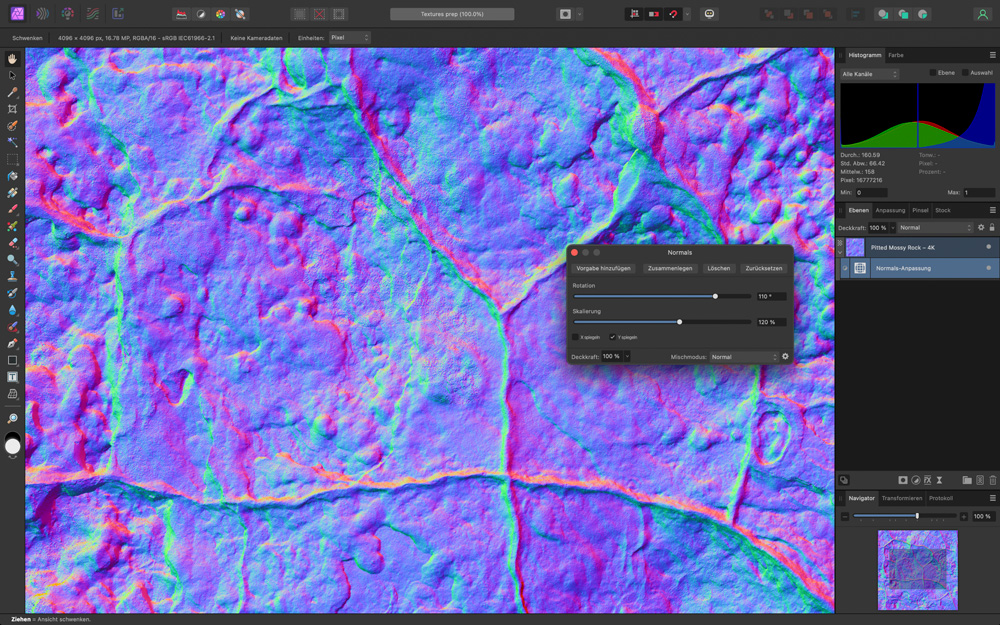 Normals-Anpassungsfunktion: Dient dazu, Beleuchtungsinformationen in bestehenden Normal Maps zu justieren. Diese Möglichkeit ist hilfreich, wenn man an Texturen arbeitet und ermöglicht sogar die Bearbeitung von Ausleuchtungsebenen, die in einer App für das 3D-Rendering erstellt wurden.