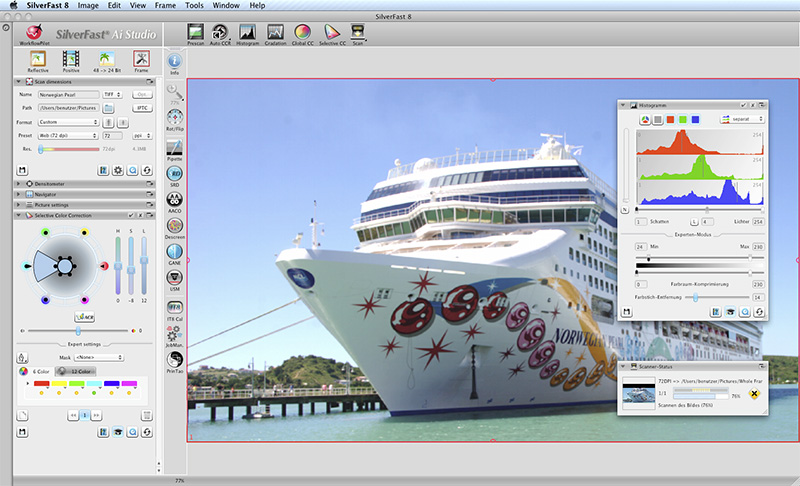 Bei den unterschiedlichen Scanaufgaben leitet der Workflow Pilot Anfänger und fortgeschrittene Anwender als Assistent in der richtigen Reihenfolge durch alle Bearbeitungsschritte. Dabei werden sie durch Hinweistexte und direkt aus der Software aufrufbare QuickTime-Movies unterstützt. Mit der NegaFix-Funktion lassen sich Negative zuverlässig als farbrichtige Positive digitalisieren. Dazu können Anwender aus mehr als 120 Filmprofilen das für Ihren Film passende wählen, das sowohl den Hersteller und den genauen Filmtyp als auch die Lichtempfindlichkeit des Films berücksichtigt. Mit zusätzlichen Schiebereglern sind anschließend Parameter wie die Filmbelichtung manuell nachjustierbar. Mit der Einstellung CCR lassen sich Farbstiche automatisch herausrechnen, auch wenn für einen Film kein Profil hinterlegt ist.