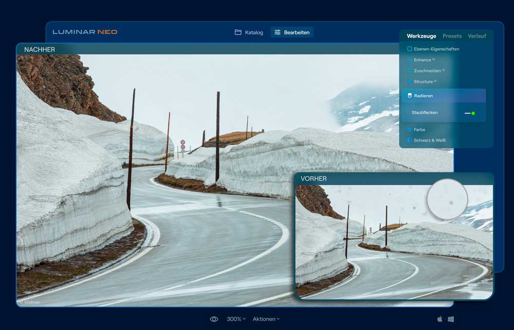 Staub EntfernenAI – Bei Außenaufnahmen können Artefakte durch Staub entstehen, der beim Objektivwechsel auf Sensor oder Objektiv gelangt. Die KI entdeckt Artefakte automatisch und Staub EntfernenAI stellt eine makelloses Korektur.
