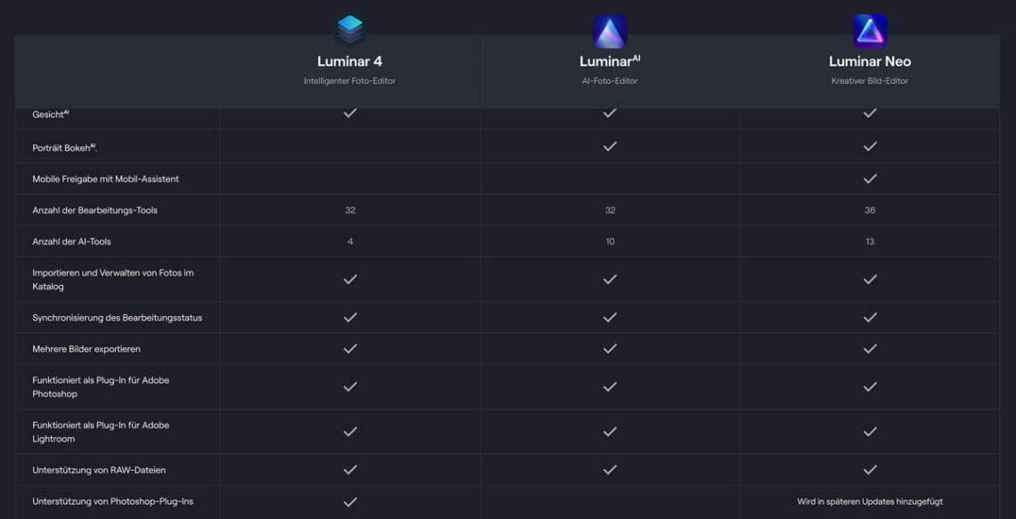 (Die vollständige Tabelle finden Sie auf skylum.com/de/luminar-neo )