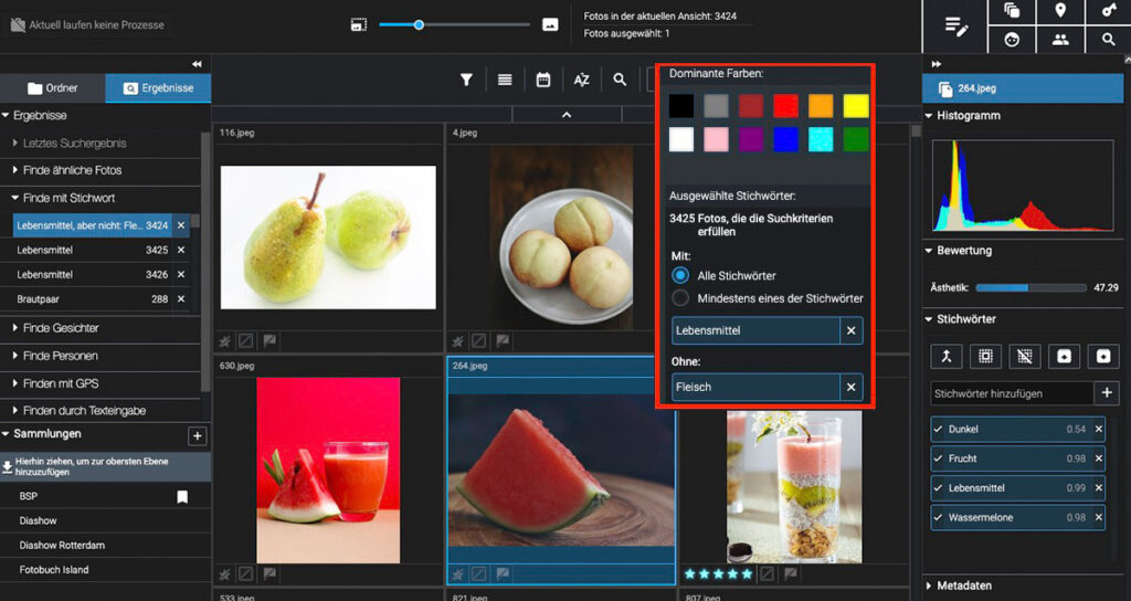 Auch die Stichwortsuche wurde um neue Funktionen erweitert. Begriffe lassen sich mit „-“ von der Suche ausschließen. Außerdem ist die Verknüpfung von Suchbegriffen mit „oder“ möglich. Einzelne oder mehrere Stichwörter können jetzt einfach per Drag & Drop auf weitere Fotos übertragen werden.