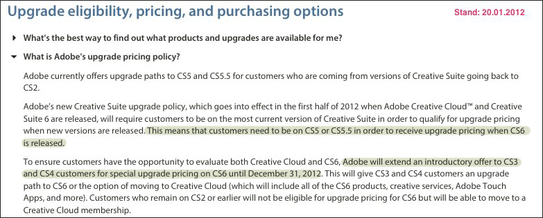 Darüber hinaus erklärt Adobe auf seiner Internetseite, dass Anwender der CS3 und CS4 ab der Markteinführung der CS6 bis zum 31. Dezember 2012 die Gelegenheit haben werden, zu einem Sonderpreis auf die CS6 upzugraden.