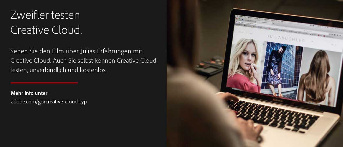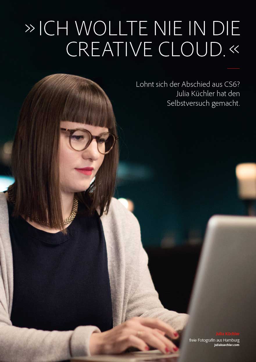Über 800.000 Fotografen, Bildbearbeiter, Designer und Grafiker in Deutschland arbeiten mit Creative Cloud von Adobe. Aber es gibt auch viele Skeptiker, wie Julia Küchler, Mode- und People-Fotografin aus Hamburg. Adobe hat Julia gebeten, Creative Cloud für sich schonungslos auf Herz und Nieren zu prüfen und dann erneut zu urteilen.