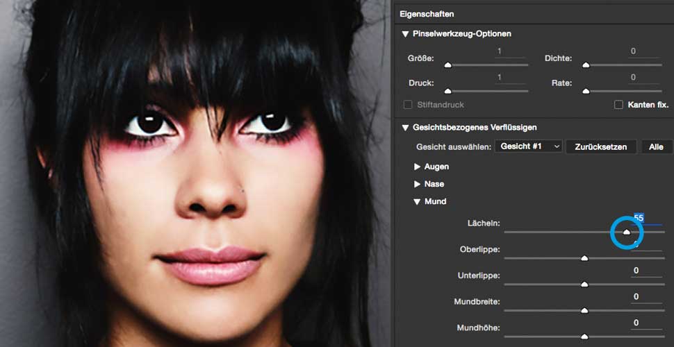 Damit sich Kreative voll auf Ihre Idee konzentrieren können, wird die Arbeit in Photoshop immer effizienter und einfacher. Beim letzten großen Creative Cloud Update im Juni 2016 kamen neue, intelligente Funktionen in Photoshop CC hinzu: Inhaltsbasierte Funktionen sind schon von Retusche-Werkzeugen bekannt und beliebt. Jetzt kommt inhaltsbasiertes Freistellen dazu. Das Werkzeug füllt automatisch die Lücken auf, die beim Drehen eines Bildes oder dem Vergrößern der Arbeitsfläche entstehen. Das Verändern von Gesichtern wird mit gesichtsbezogenem Verflüssigen dank intelligenter Funktionen auch für Photoshop-Einsteiger möglich. Um die Augen in einem Porträt zu vergrößern, reicht eine Einstellung am Schieberegler.