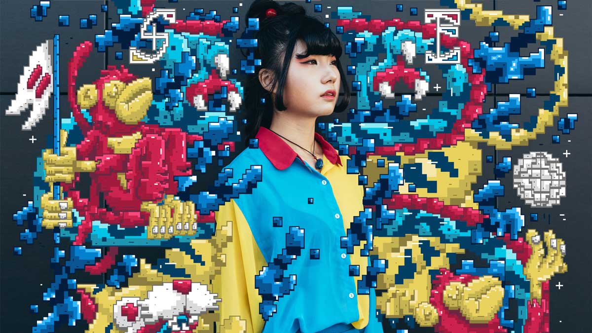 Zum Trend „Das flüssige Selbst“ nimmt der Berliner Künstler Dennis Schuster aka DXTR – The Weird die Herausforderung an. Für ihn steht das Thema für Veränderung und Aufbruch in unserer Gesellschaft. Als Ausgangsmotiv für sein Artwork hat er das Bild eines asiatischen Models mit auffälligem Style gewählt.