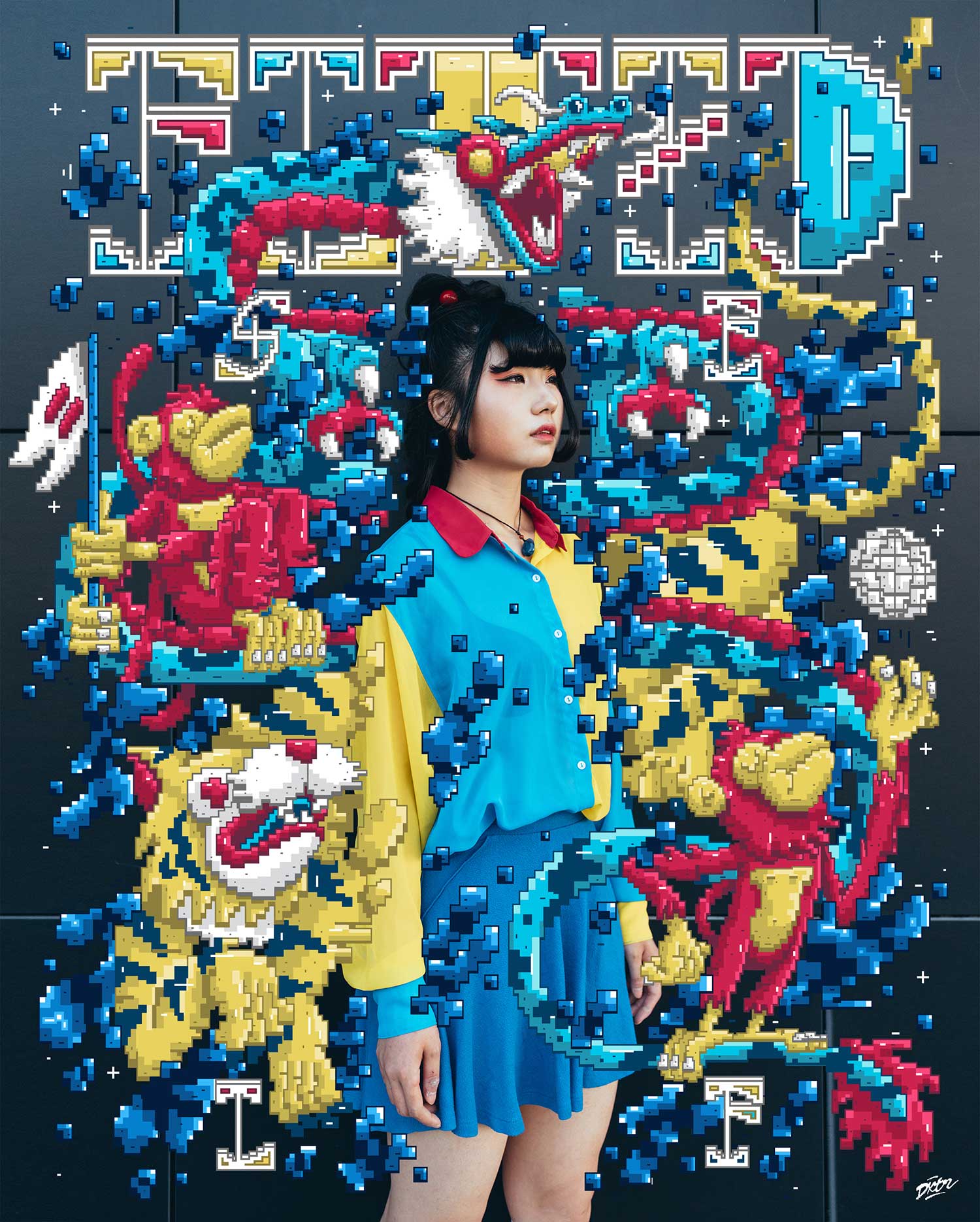 In der Umsetzung entschied er sich ganz bewusst dazu, einen Kontrast zur ruhigen Fotografie schaffen, indem er eine dynamische und organische Komposition im 8-Bit Pixel/Mosaic Stil kreierte. Die verträumt wirkende junge Frau wird umgeben von Figuren aus der asiatischen Symbolik: Tiger, Drache und Affe verbildlichen hier die Stärke und Kraft der Gedanken des Mädchens. Die aufsteigende, positive Dynamik der gesamten Komposition betont außerdem den visionären Aufbruchsgedanken einer gleichgestellten Welt.