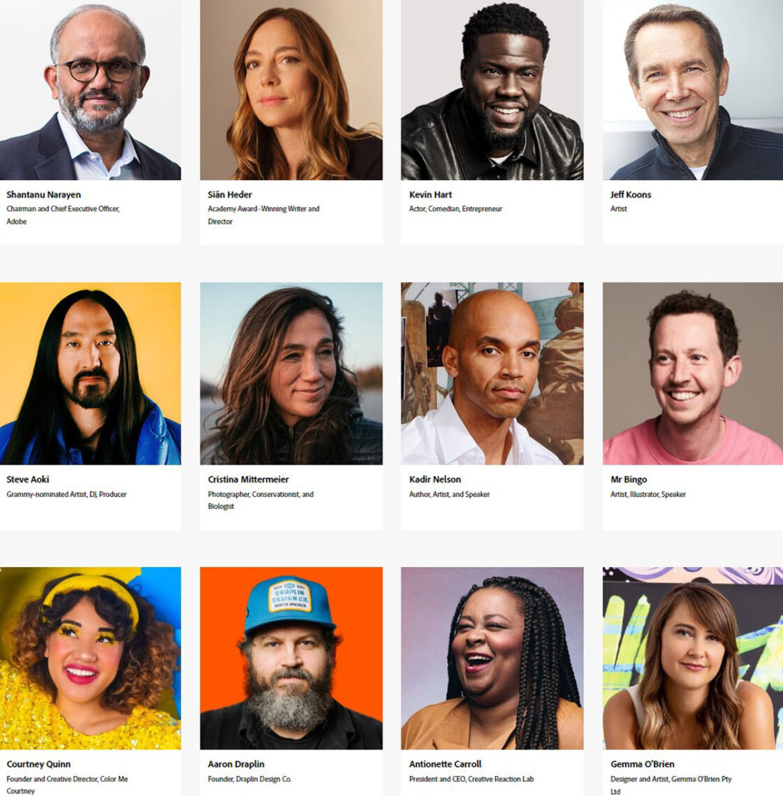 Von Fotografie über Grafik bis hin zu Bewegtbild: Kreativität hat unzählig viele Facetten und jede*r Künstler*in hat eine ganz eigene Herangehensweise. Doch egal, ob ihr bereits mit beiden Beinen fest im Kreativ-Business steht oder noch auf der Suche nach eurem individuellen Weg seid – eine gute Dosis Inspiration geht immer. Auch in diesem Jahr hat Adobe mit der Oscar-prämierten Regisseurin Siân Heder, dem Grammy-nominierten Künstler, Produzenten und DJ Steve Aoki, dem Schauspieler und Comedian Kevin Hart oder dem berühmten Künstler Jeff Koons eine große Bandbreite namhafter und mitreißender Speaker*innen für euch dabei. Freut euch außerdem auf Vordenker*innen der Kreativbranche wie Antionette Carroll oder Courtney Quinn, Illustrator*innen wie Mr. Bingo und Zipeng Zhu oder Fotograf*innen wie Cristina Mittermeier.