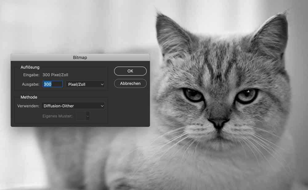 Ich habe den Workflow in der aktuellen Photshop-Version nachempfunden und glaube, dass Punkt 2: „Bitmap in Schwarz-Weiß für einen fotokopierten Grunge-Effekt“ wohl nicht so funktioniert, wie angegeben. Kein Wort, dass das Bild in 8bit/Kanal umgewandelt werden muß, damit Bitmap nach der Reduktion auf Graustufen aktiv ist.