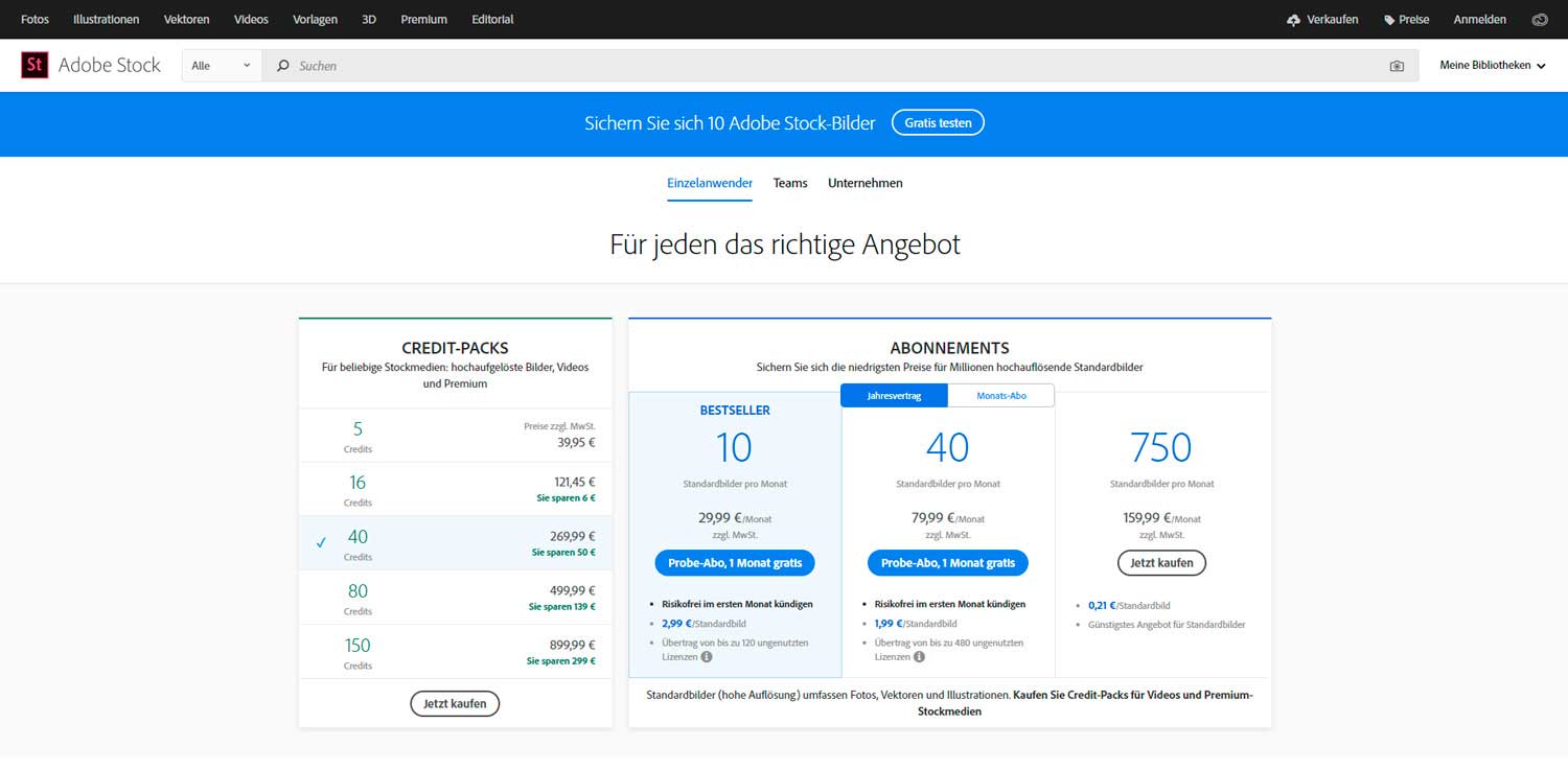 Und weil verschiedene Adobe Stock Nutzer ganz unterschiedliche Ansprüche haben, gibt es für wirklich jeden das richtige Abonnement: Ob Einzelanwender oder ganze Teams, Lizenzen für Printausgaben oder Merchandise-Produkte, zehn oder 750 Bilder pro Monat – hier wird jeder glücklich. Jetzt aber genug der Worte: Augen auf, Lauscher spitzen und Schritt für Schritt vom Profi lernen, wie es funktioniert!