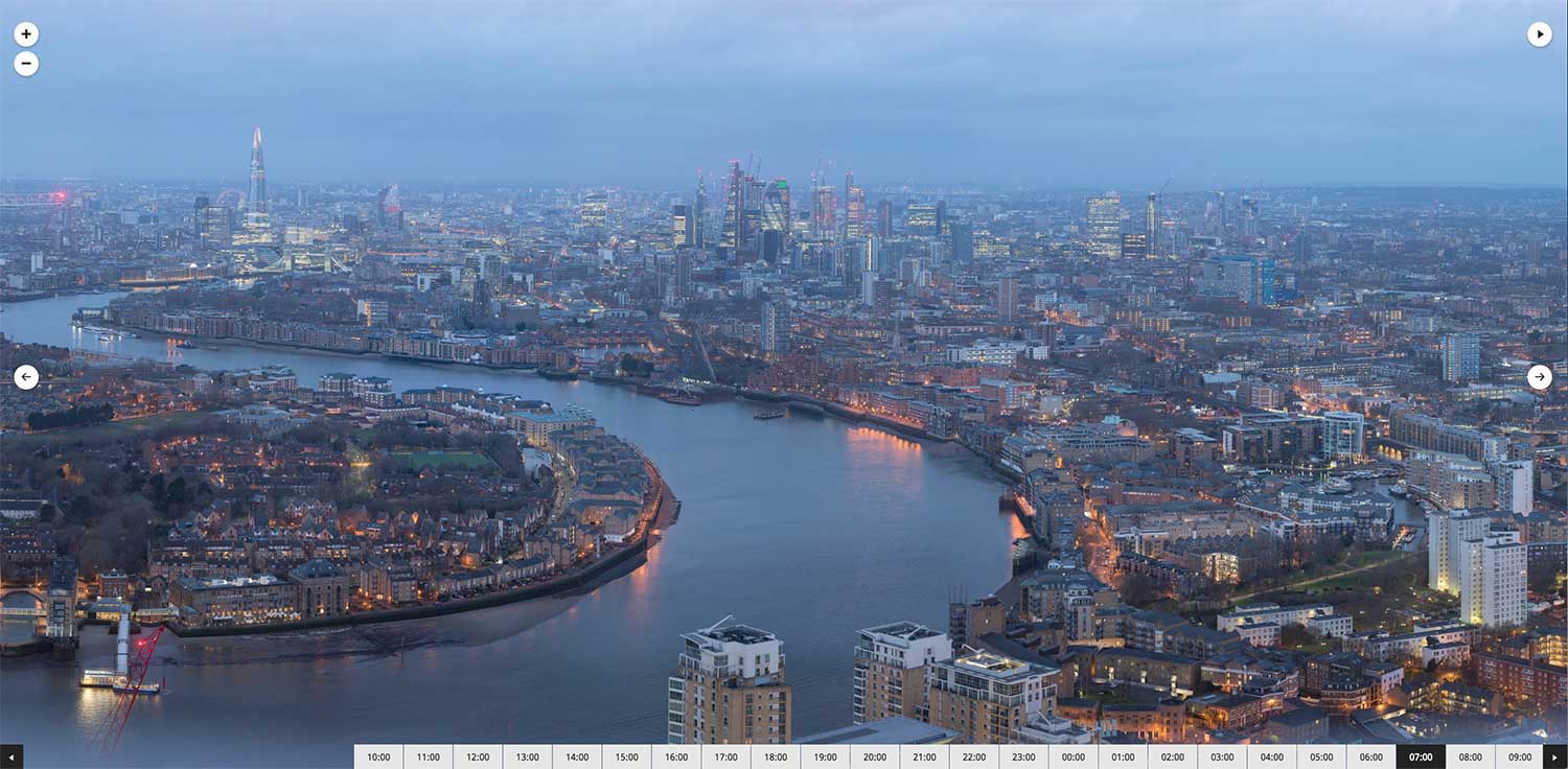 Gigapixel-Bilder von Städten gibt es mittlerweile viele, das Besondere an „24 Stunden London“ ist jedoch, dass es sich um ein Zeitrafferbild handelt. Die Aufnahmen wurden über einen kompletten Tag hinweg stündlich wiederholt. An der Zeitleiste kann man sich im Stundenabstand durch die verschiedenen Tageszeiten klicken. Wie bei Gigapixel-Panoramen üblich, lässt sich jeder Bereich des Bildes stark und detailreich vergrößern.