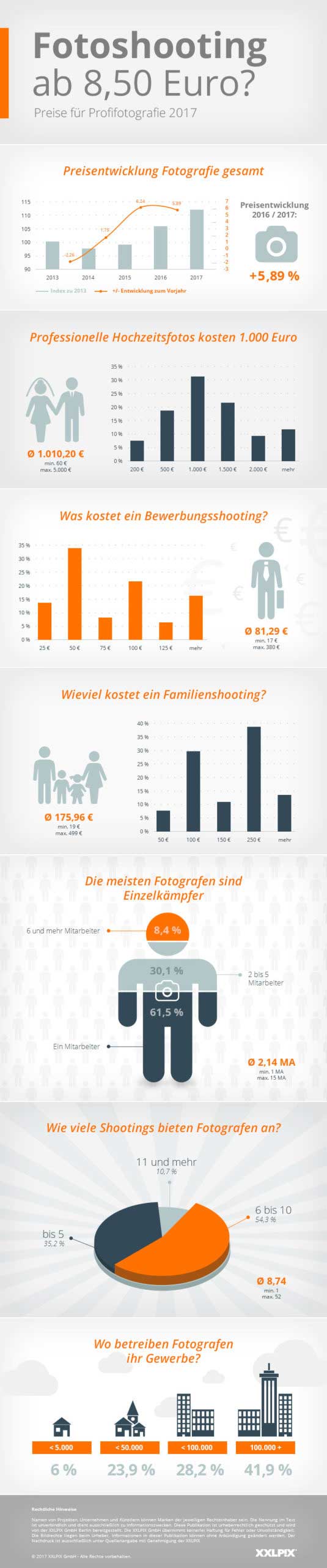 Die Preise für professionelle Fotografie steigen 2017 erneut. Das ergab die jährliche Marktpreisstudie Fotoshooting ab 8,50 Euro für Fotografen und Fotostudios des Berliner Fachlabors XXLPIX. Insgesamt verzeichnet die Studie einen Preisanstieg für gewerbliche Foto-Dienstleistungen um 5,89 % im Vergleich zum Vorjahr. Zu diesen Ergebnissen führte nach Angaben vonXXLPIX die Analyse von über 2.000 Fotoshooting-Preisen in ganz Europa. Die detaillierte Auswertung der Daten steht jetzt in einer 27-seitigen Marktanalyse zum Download zur Verfügung.