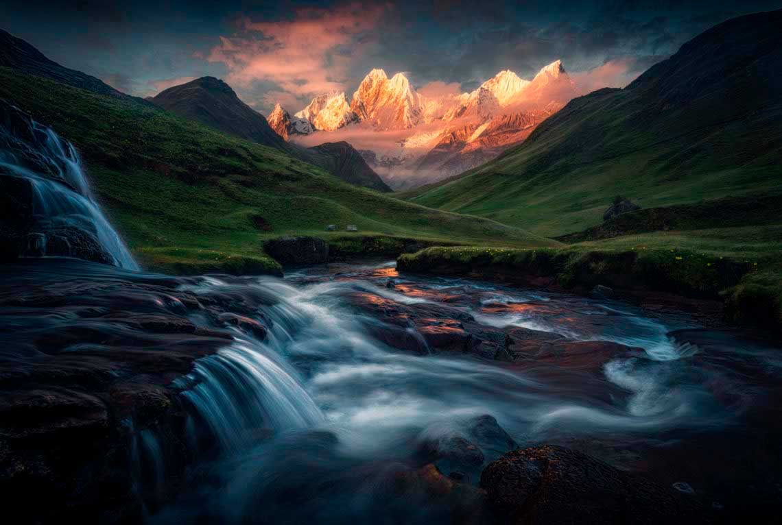 Wenn Sie in einem Tal von unten fotografieren, mit einem Berg im Hintergrund, empfehle ich Ihnen, die Sonne von hinten aufgehen zu lassen, damit der Berg das erste oder letzte Licht einfängt. Es kann besonders eindrucksvoll sein, wenn Sie etwas Wasser vor sich haben, das das Licht reflektiert.