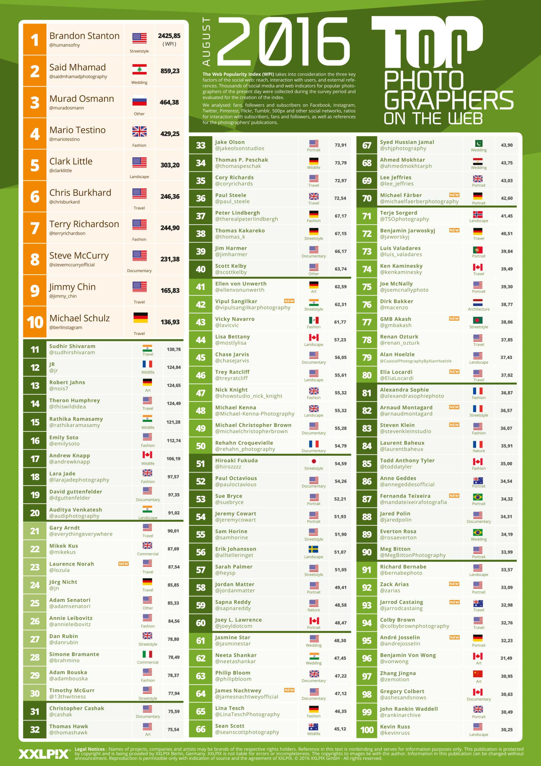 Nach Angaben von XXLPIX werden internationale Fotografen immer populärer. Die Stars der Szene spielen heute in einer Liga mit weltweit bekannten Sportstars. Der aktuell führende im TOP100-Ranking – Brandon Stanton – erreicht mit seiner Fotografie über 23 Millionen Nutzer weltweit. Damit liegt er deutlich vor dem internationalen Sprint-Superstar Usain Bolt. Ihm folgen nur 17 Millionen Nutzer auf Facebook.