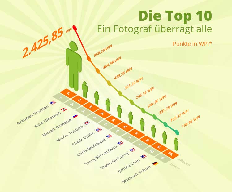 Der Algorithmus hinter dem Ranking – „Web Popularity Index“ (WPI) genannt – berücksichtigt die drei wesentlichen Faktoren des Social Web: Reichweite, Interaktion mit Nutzern und externe Referenzen. Für den Indexwert wurden über 5000 Social Media- und Web-Kennzahlen hunderter Fotografen erhoben.