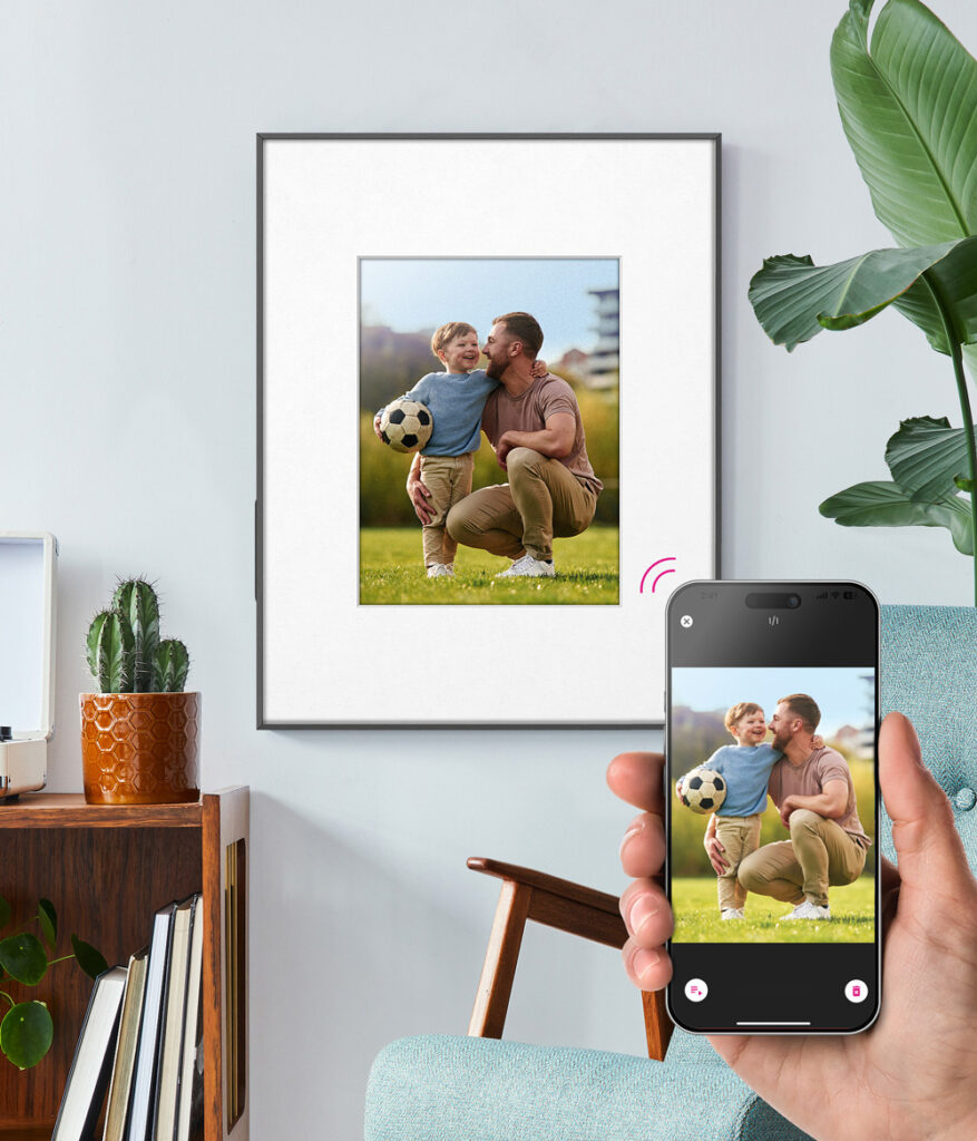Der Aluratek ePaper Wi-Fi Digital Photo Frame im 4:3-Format stellt 1200 × 1600 Pixel dar und bietet 13,3 Zoll Bilddiagonale. Das Gehäuse ist minimalistisch gehalten und lässt sich mit wechselbaren Passepartouts in Schwarz oder Weiß an verschiedene Einrichtungsstile anpassen. Die Montage erfolgt wahlweise an der Wand – vertikal oder horizontal – oder auf einem Tisch mittels mitgeliefertem Acrylständer. Da keine sichtbaren Stromkabel stören, eignet sich der Rahmen auch für repräsentative Orte wie Galerien, Empfangsbereiche oder Wohnzimmer.