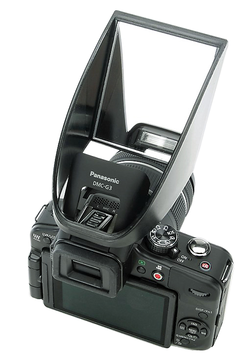 Der handliche „Lightscoop“ ermöglicht das indirekte Blitzen mit dem integrierten Kamerablitz.