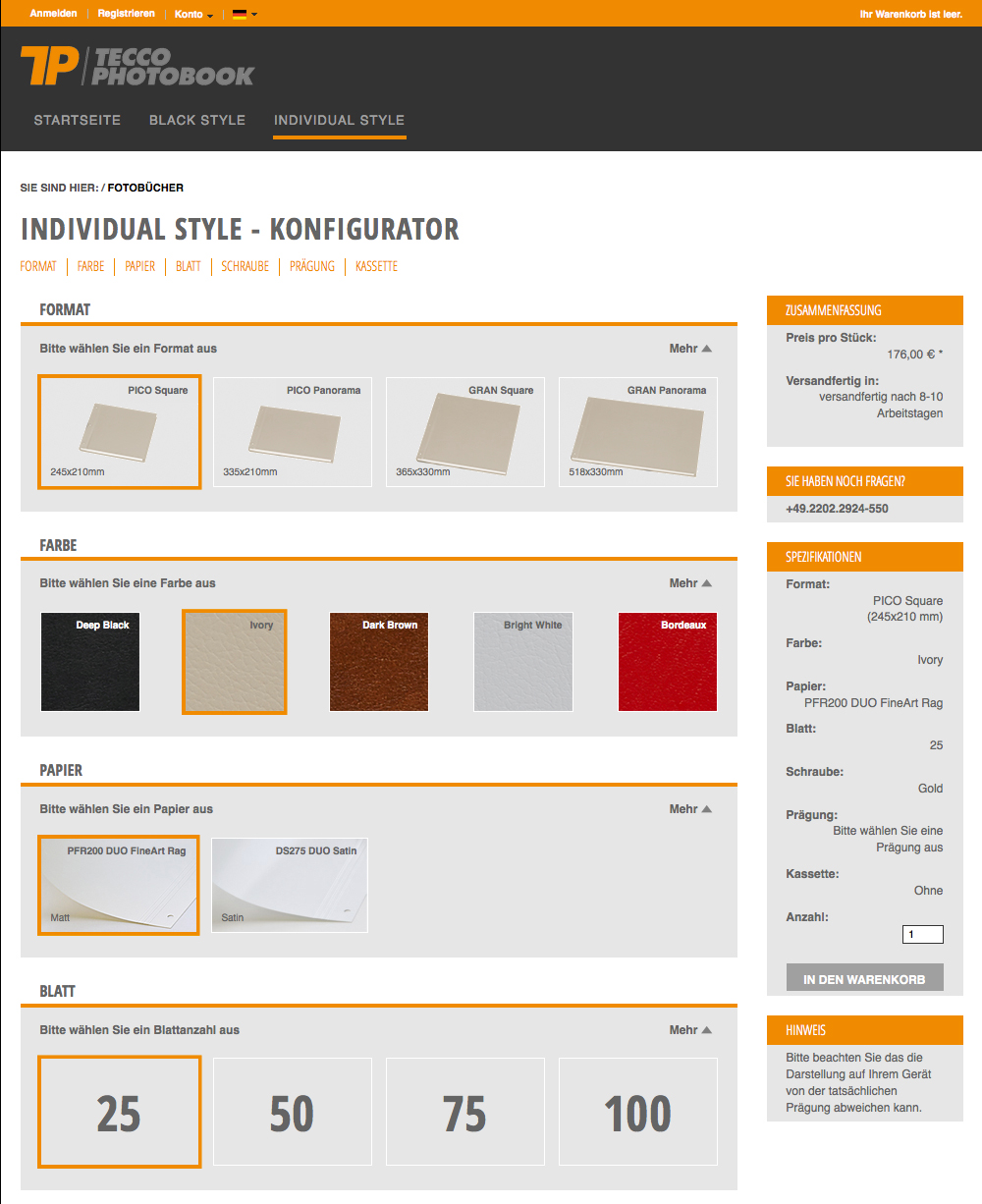 Das TECCO:BOOK ist in vier verschiedenen Größen und fünf Farben erhältlich. Zur Auswahl stehen zwei Papiere (Duo Satin 270 DS270 und Photo FineArtRag PFR200 Duo) und vier Buchstärken, bis zu vier Blattzahloptionen (25, 50, 75 oder 100 Blatt), drei verschiedenfarbige Buchschrauben (gold, silber, schwarz), neun Möglichkeiten zur Plazierung von Schriften, sowie je drei Schriftfarben und -arten. Die Preisangabe erfolgt sofort, da der Konfigurator in einen Shop integriert ist. Optional ist für jede Buchgröße eine Kassette – für Schutz, Transport und Aufbewahrung – in den Farben Creme und Schwarz erhältlich.